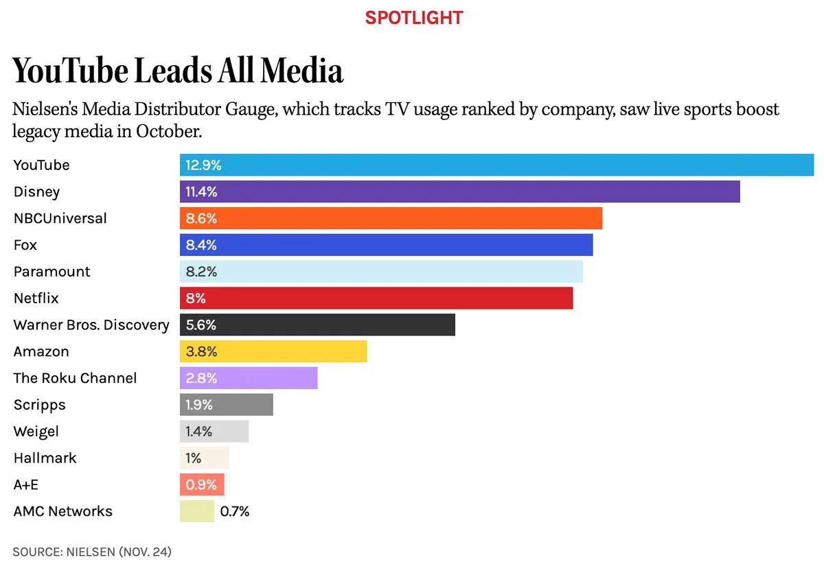 YouTube leads all media, but legacy studios saw a live sports boost in Nielsen’s latest snapshot of TV distributors